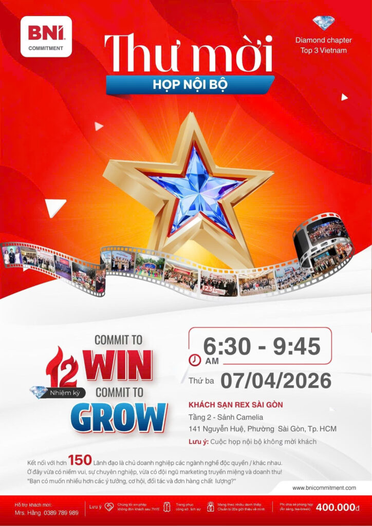 Tham gia BNI Diamond Commitment Chapter để kết nối với hơn 100 chủ doanh nghiệp, mở rộng thị trường và gia tăng doanh thu qua hệ thống referral chất lượng, minh bạch, hiệu quả. Đây là môi trường chuyên nghiệp, cam kết kết quả, giúp bạn phát triển kỹ năng, tối ưu kinh doanh và xây dựng quan hệ bền vững, đồng hành cùng những doanh nhân thành công, tư duy đột phá.